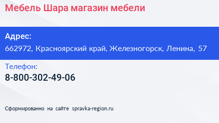 Мебель Шара, магазин мебели по адресу 662972, Красноярский край, Железногорск, Ленина, 57 в дальнейшем Организация, размещена в следующих категориях: