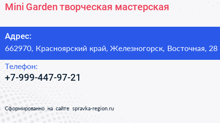 Mini Garden, творческая мастерская по адресу 662970, Красноярский край, Железногорск, Восточная, 28 в дальнейшем Организация, размещена в следующих категориях: