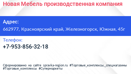 Новая Мебель, производственная компания по адресу 662977, Красноярский край, Железногорск, Южная, 45г в дальнейшем Организация, размещена в следующих категориях: