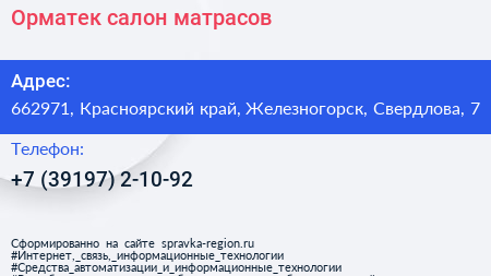 Орматек, салон матрасов по адресу 662971, Красноярский край, Железногорск, Свердлова, 7 в дальнейшем Организация, размещена в следующих категориях: