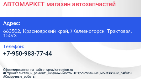 АВТОМАРКЕТ, магазин автозапчастей по адресу 663502, Красноярский край, Железногорск, Трактовая, 150/3 в дальнейшем Организация, размещена в следующих категориях: