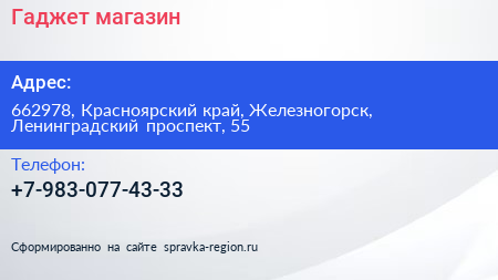 Гаджет, магазин по адресу 662978, Красноярский край, Железногорск, Ленинградский проспект, 55 в дальнейшем Организация, размещена в следующих категориях: