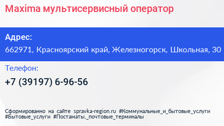 Maxima, мультисервисный оператор по адресу 662971, Красноярский край, Железногорск, Школьная, 30 в дальнейшем Организация, размещена в следующих категориях: