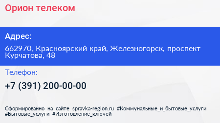 Орион телеком по адресу 662970, Красноярский край, Железногорск, проспект Курчатова, 48 в дальнейшем Организация, размещена в следующих категориях: