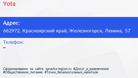 Yota по адресу 662972, Красноярский край, Железногорск, Ленина, 57 в дальнейшем Организация, размещена в следующих категориях: