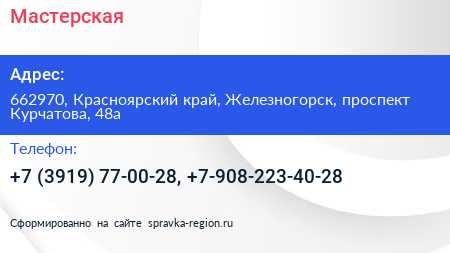 Мастерская по адресу 662970, Красноярский край, Железногорск, проспект Курчатова, 48а в дальнейшем Организация, размещена в следующих категориях: