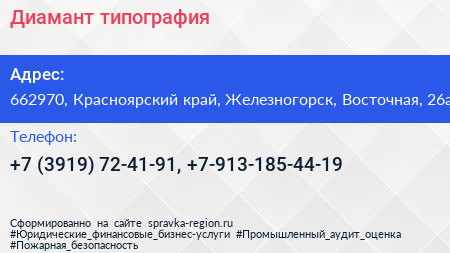 Диамант, типография по адресу 662970, Красноярский край, Железногорск, Восточная, 26а в дальнейшем Организация, размещена в следующих категориях: