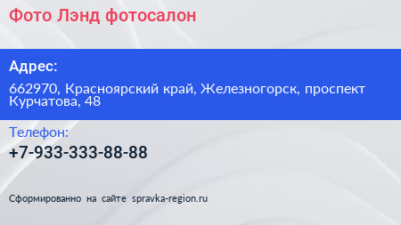 Фото Лэнд, фотосалон по адресу 662970, Красноярский край, Железногорск, проспект Курчатова, 48 в дальнейшем Организация, размещена в следующих категориях: