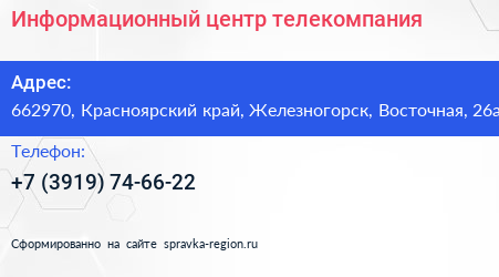 Информационный центр, телекомпания по адресу 662970, Красноярский край, Железногорск, Восточная, 26а в дальнейшем Организация, размещена в следующих категориях: