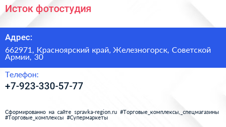Исток, фотостудия по адресу 662971, Красноярский край, Железногорск, Советской Армии, 30 в дальнейшем Организация, размещена в следующих категориях: