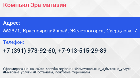 КомпьютЭра, магазин по адресу 662971, Красноярский край, Железногорск, Свердлова, 7 в дальнейшем Организация, размещена в следующих категориях: