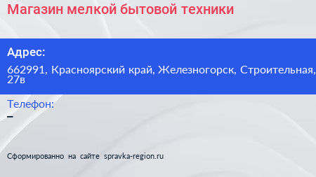 Магазин мелкой бытовой техники по адресу 662991, Красноярский край, Железногорск, Строительная, 27в в дальнейшем Организация, размещена в следующих категориях: