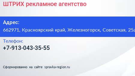 ШТРИХ, рекламное агентство по адресу 662971, Красноярский край, Железногорск, Советская, 25а в дальнейшем Организация, размещена в следующих категориях: