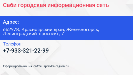 Саби, городская информационная сеть по адресу 662978, Красноярский край, Железногорск, Ленинградский проспект, 7 в дальнейшем Организация, размещена в следующих категориях:
