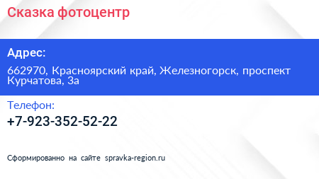Сказка, фотоцентр по адресу 662970, Красноярский край, Железногорск, проспект Курчатова, 3а в дальнейшем Организация, размещена в следующих категориях: