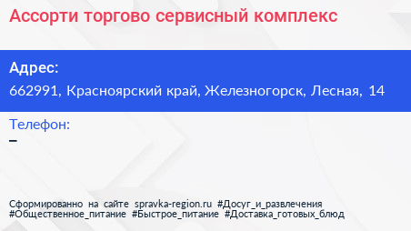 Ассорти, торгово-сервисный комплекс по адресу 662991, Красноярский край, Железногорск, Лесная, 14 в дальнейшем Организация, размещена в следующих категориях:
