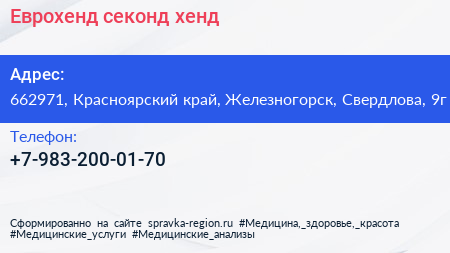 Еврохенд, секонд-хенд по адресу 662971, Красноярский край, Железногорск, Свердлова, 9г в дальнейшем Организация, размещена в следующих категориях: