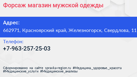Форсаж, магазин мужской одежды по адресу 662971, Красноярский край, Железногорск, Свердлова, 11 в дальнейшем Организация, размещена в следующих категориях: