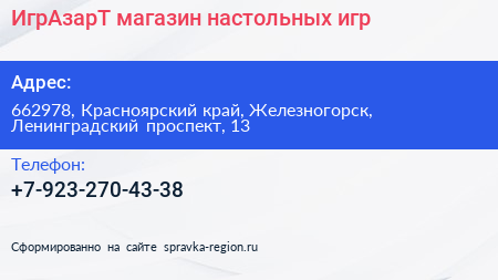 ИгрАзарТ, магазин настольных игр по адресу 662978, Красноярский край, Железногорск, Ленинградский проспект, 13 в дальнейшем Организация, размещена в следующих категориях: