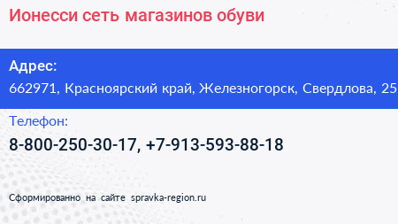 Ионесси, сеть магазинов обуви по адресу 662971, Красноярский край, Железногорск, Свердлова, 25 в дальнейшем Организация, размещена в следующих категориях: