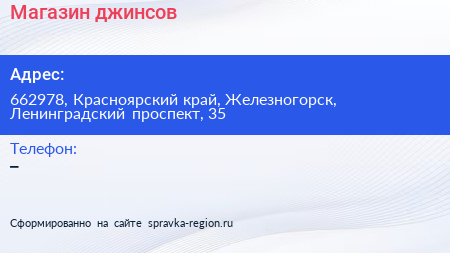 Магазин джинсов по адресу 662978, Красноярский край, Железногорск, Ленинградский проспект, 35 в дальнейшем Организация, размещена в следующих категориях: