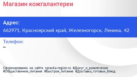 Магазин кожгалантереи по адресу 662971, Красноярский край, Железногорск, Ленина, 42 в дальнейшем Организация, размещена в следующих категориях: