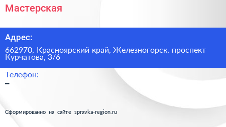 Мастерская по адресу 662970, Красноярский край, Железногорск, проспект Курчатова, 3/6 в дальнейшем Организация, размещена в следующих категориях: