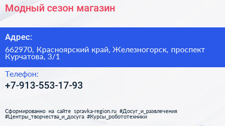 Модный сезон, магазин по адресу 662970, Красноярский край, Железногорск, проспект Курчатова, 3/1 в дальнейшем Организация, размещена в следующих категориях: