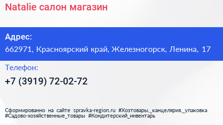 Natalie, салон-магазин по адресу 662971, Красноярский край, Железногорск, Ленина, 17 в дальнейшем Организация, размещена в следующих категориях: