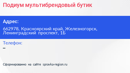 Подиум, мультибрендовый бутик по адресу 662978, Красноярский край, Железногорск, Ленинградский проспект, 1Б в дальнейшем Организация, размещена в следующих категориях: