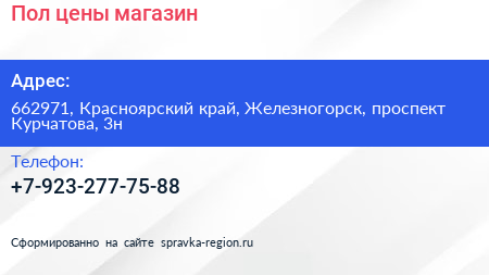 Пол цены, магазин по адресу 662971, Красноярский край, Железногорск, проспект Курчатова, 3н в дальнейшем Организация, размещена в следующих категориях: