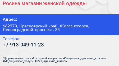 Росина, магазин женской одежды по адресу 662978, Красноярский край, Железногорск, Ленинградский проспект, 35 в дальнейшем Организация, размещена в следующих категориях: