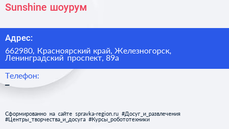 Sunshine, шоурум по адресу 662980, Красноярский край, Железногорск, Ленинградский проспект, 89а в дальнейшем Организация, размещена в следующих категориях: