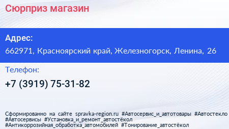 Сюрприз, магазин по адресу 662971, Красноярский край, Железногорск, Ленина, 26 в дальнейшем Организация, размещена в следующих категориях: