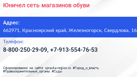 Юничел, сеть магазинов обуви по адресу 662971, Красноярский край, Железногорск, Свердлова, 16 в дальнейшем Организация, размещена в следующих категориях: