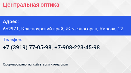 Центральная оптика по адресу 662971, Красноярский край, Железногорск, Кирова, 12 в дальнейшем Организация, размещена в следующих категориях: