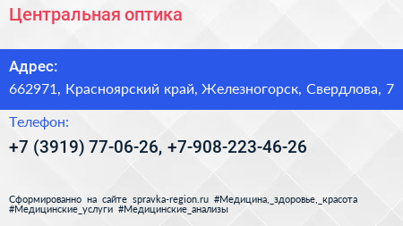 Центральная оптика по адресу 662971, Красноярский край, Железногорск, Свердлова, 7 в дальнейшем Организация, размещена в следующих категориях: