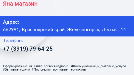 Яна, магазин по адресу 662991, Красноярский край, Железногорск, Лесная, 14 в дальнейшем Организация, размещена в следующих категориях: