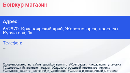 Бонжур, магазин по адресу 662970, Красноярский край, Железногорск, проспект Курчатова, 3а в дальнейшем Организация, размещена в следующих категориях:
