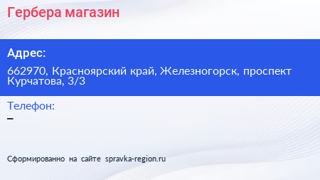 Гербера, магазин по адресу 662970, Красноярский край, Железногорск, проспект Курчатова, 3/3 в дальнейшем Организация, размещена в следующих категориях: