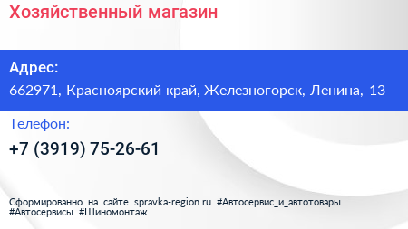 Хозяйственный магазин по адресу 662971, Красноярский край, Железногорск, Ленина, 13 в дальнейшем Организация, размещена в следующих категориях: