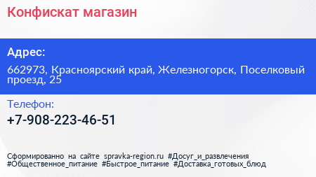 Конфискат, магазин по адресу 662973, Красноярский край, Железногорск, Поселковый проезд, 25 в дальнейшем Организация, размещена в следующих категориях: