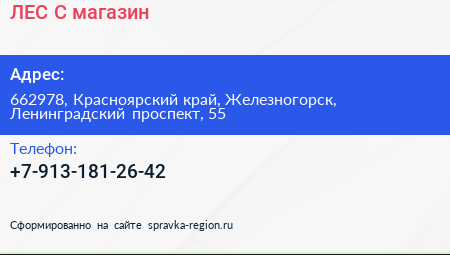 ЛЕС-С, магазин по адресу 662978, Красноярский край, Железногорск, Ленинградский проспект, 55 в дальнейшем Организация, размещена в следующих категориях: