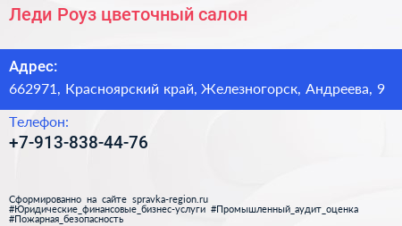 Леди Роуз, цветочный салон по адресу 662971, Красноярский край, Железногорск, Андреева, 9 в дальнейшем Организация, размещена в следующих категориях: