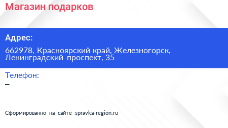 Магазин подарков по адресу 662978, Красноярский край, Железногорск, Ленинградский проспект, 35 в дальнейшем Организация, размещена в следующих категориях: