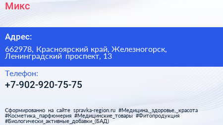 Микс по адресу 662978, Красноярский край, Железногорск, Ленинградский проспект, 13 в дальнейшем Организация, размещена в следующих категориях: