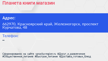 Планета книги, магазин по адресу 662970, Красноярский край, Железногорск, проспект Курчатова, 48 в дальнейшем Организация, размещена в следующих категориях: