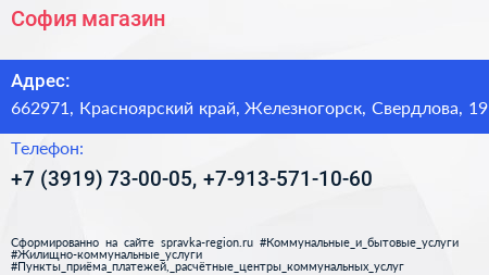 София, магазин по адресу 662971, Красноярский край, Железногорск, Свердлова, 19 в дальнейшем Организация, размещена в следующих категориях: