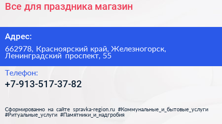 Все для праздника, магазин по адресу 662978, Красноярский край, Железногорск, Ленинградский проспект, 55 в дальнейшем Организация, размещена в следующих категориях: