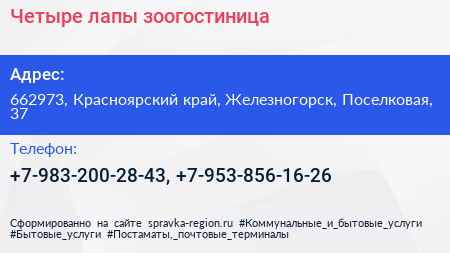 Четыре лапы, зоогостиница по адресу 662973, Красноярский край, Железногорск, Поселковая, 37 в дальнейшем Организация, размещена в следующих категориях: